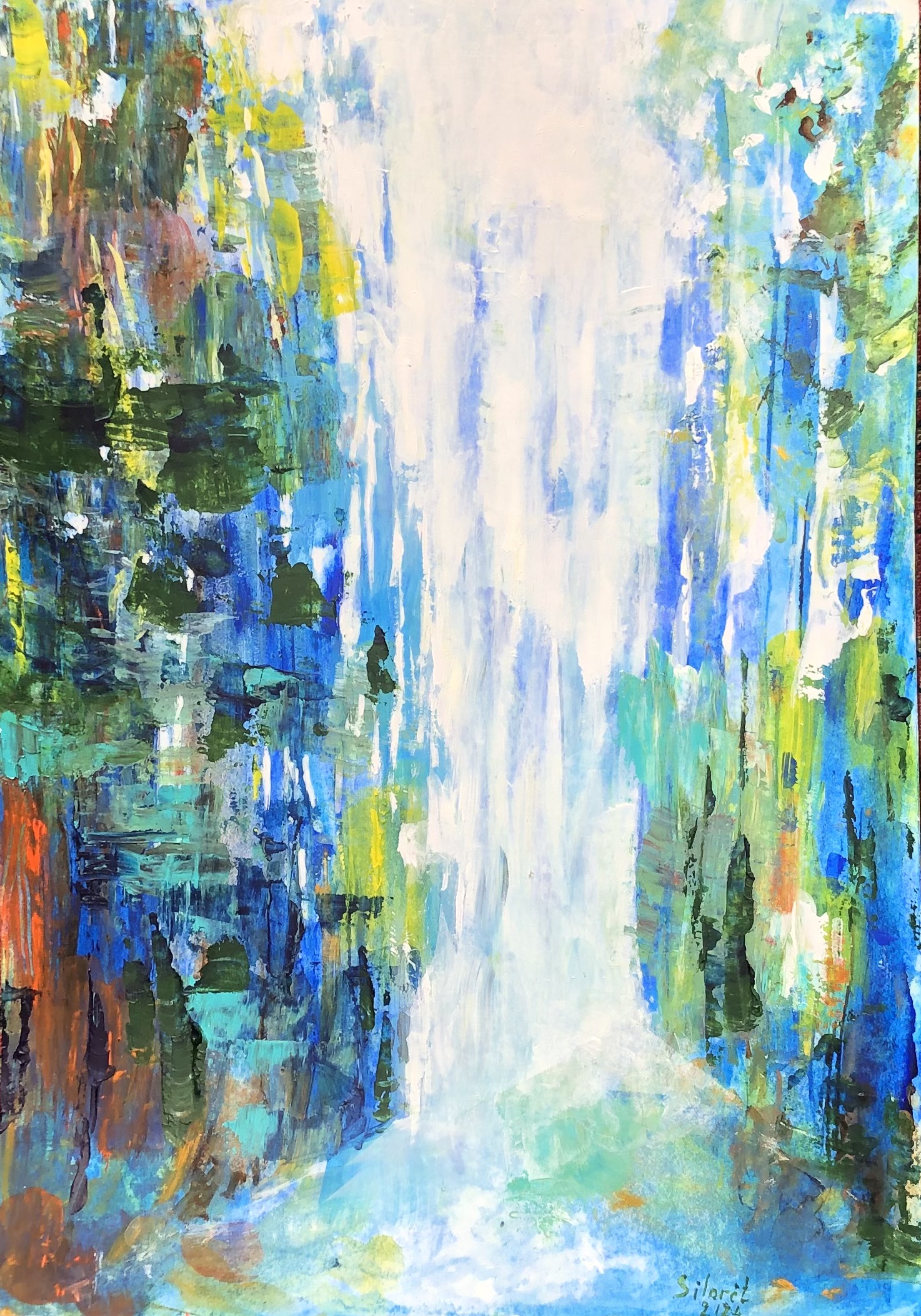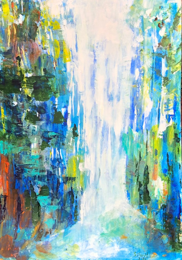 2024 – acrylique lumière et arbres bleu jaune vert 42 x 30