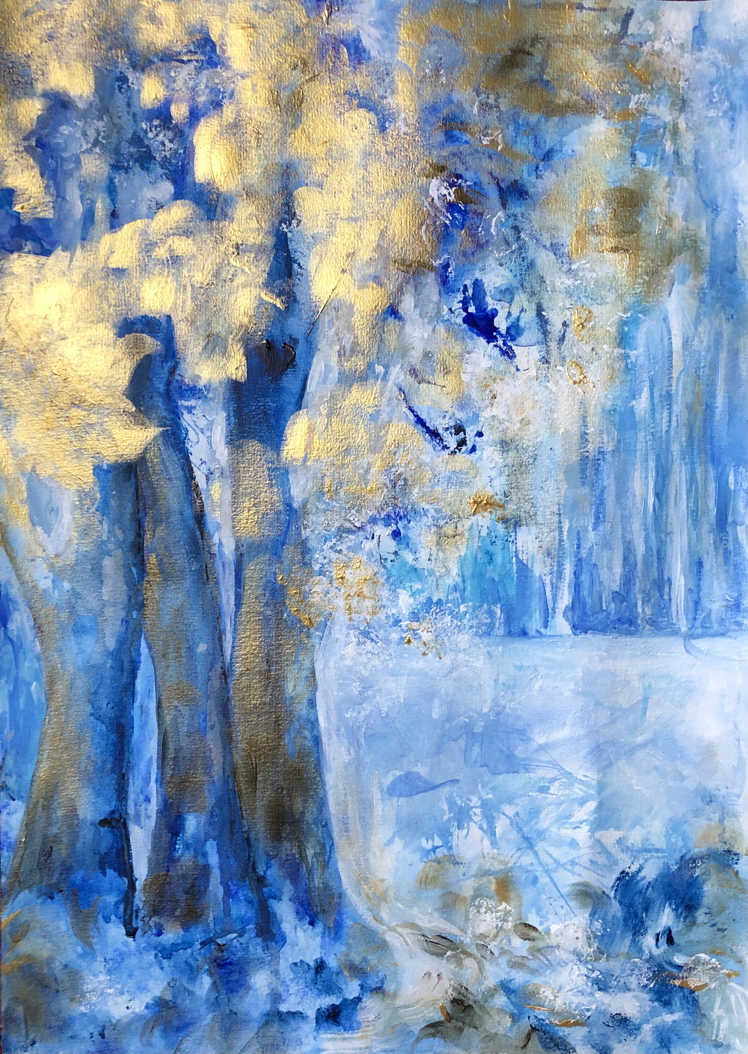 2024 – acrylique lumière et arbres bleu & or 42 x 30