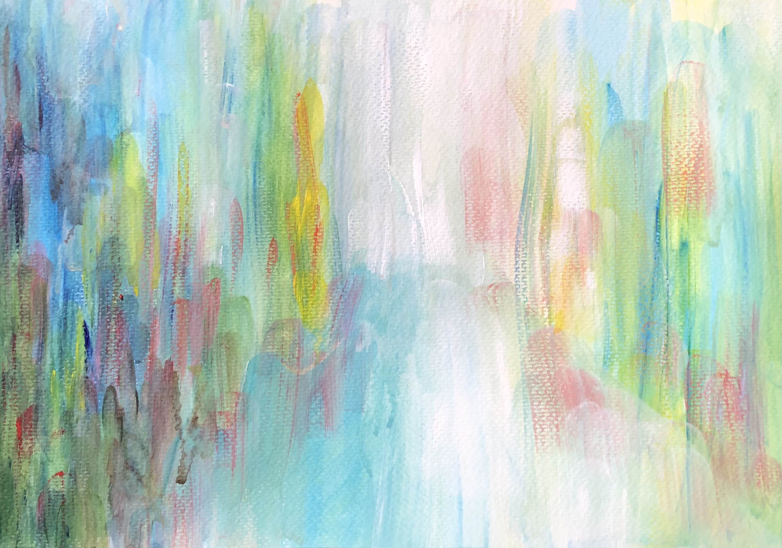 2024 – acrylique lumière et arbres pastel bleu & vert 21 x 30