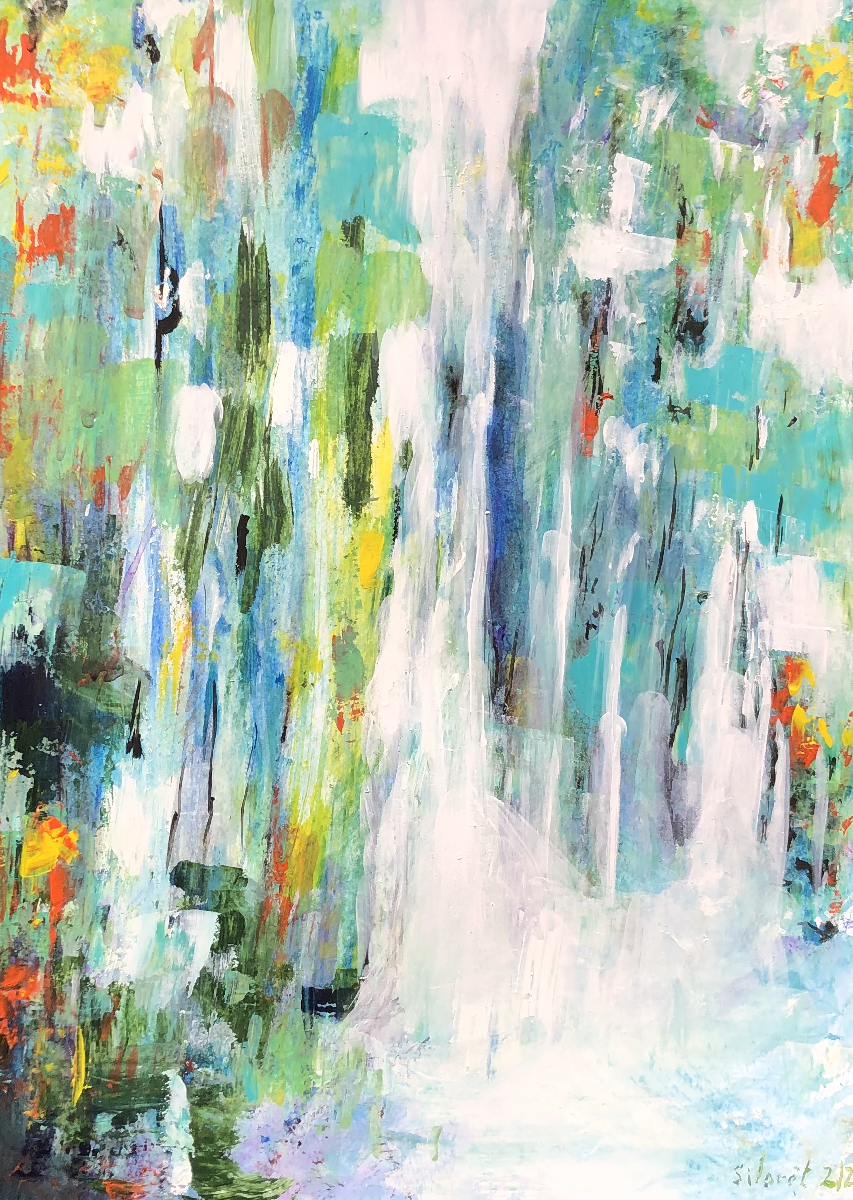 2024 – acrylique lumière et arbres turquoise bleu clair jaune 42 x 30